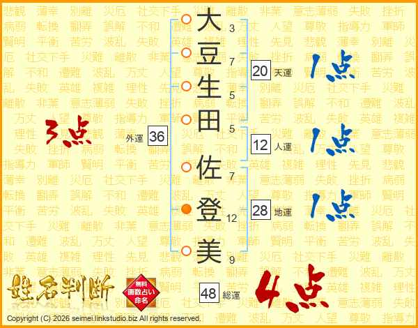 大(3画)豆(7画)生(5画)田(5画) 佐(7画)登(12画)美(9画)