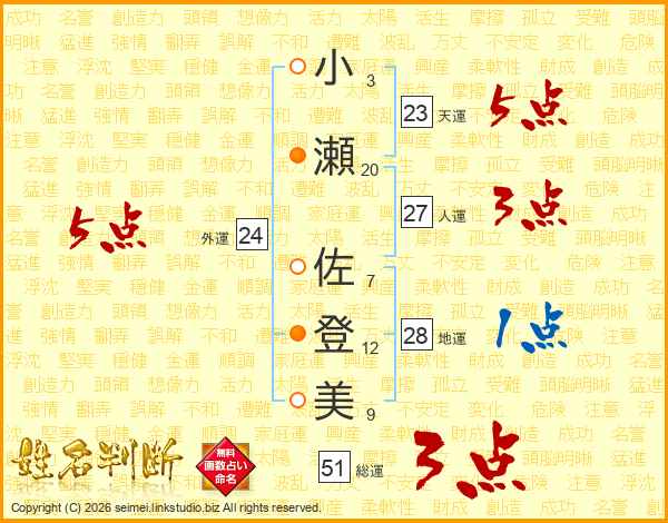 小瀬佐登美さんの総運は51画の3点!