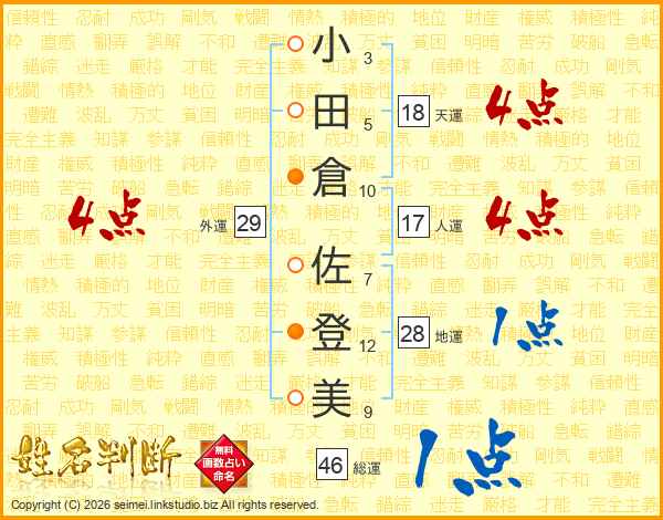 小(3画)田(5画)倉(10画) 佐(7画)登(12画)美(9画)