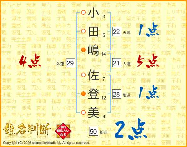 小(3画)田(5画)嶋(14画) 佐(7画)登(12画)美(9画)