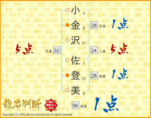 小(3画)金(8画)沢(17画) 佐(7画)登(12画)美(9画)