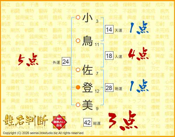 小鳥佐登美さんの総運は42画の3点!
