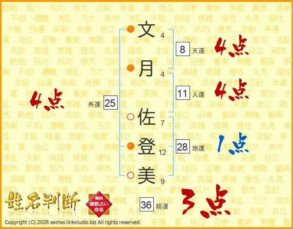 文(4画)月(4画) 佐(7画)登(12画)美(9画)