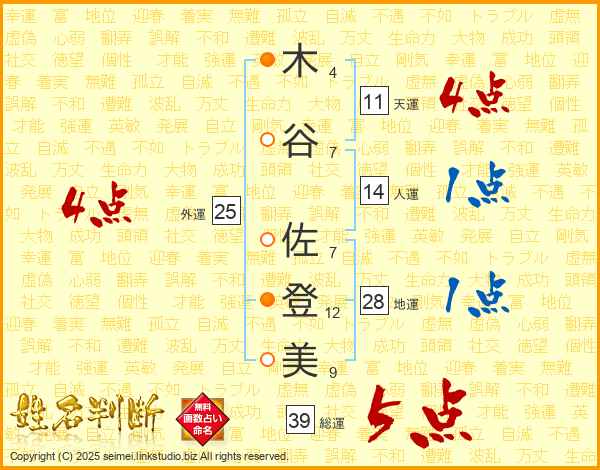 木(4画)谷(7画) 佐(7画)登(12画)美(9画)