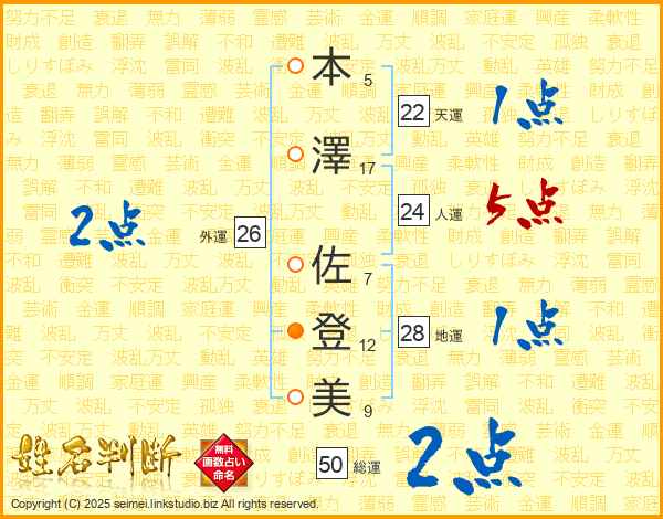 本(5画)澤(17画) 佐(7画)登(12画)美(9画)