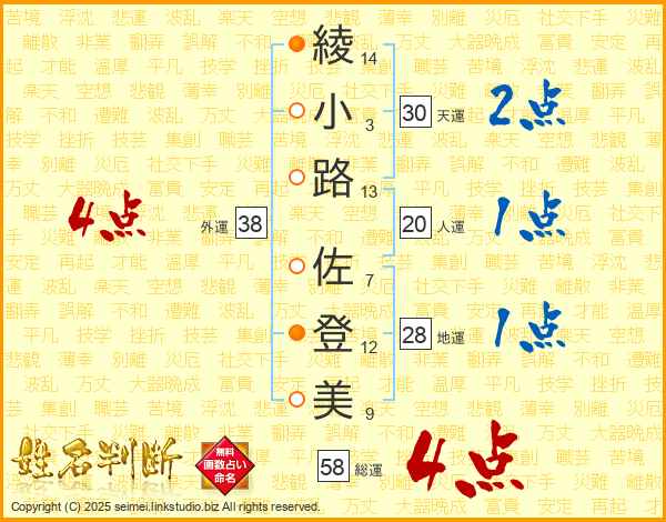 綾(14画)小(3画)路(13画) 佐(7画)登(12画)美(9画)