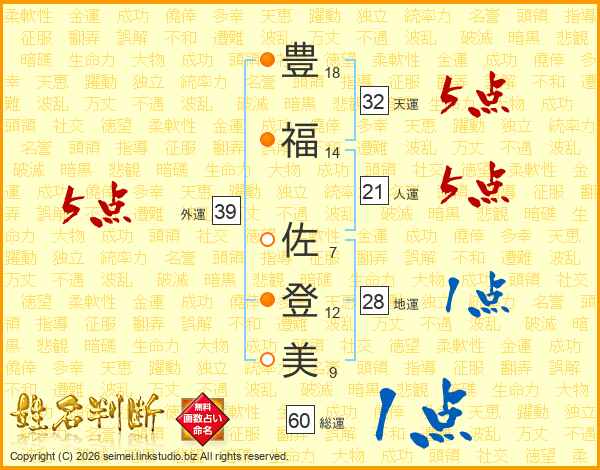 豊(18画)福(14画) 佐(7画)登(12画)美(9画)