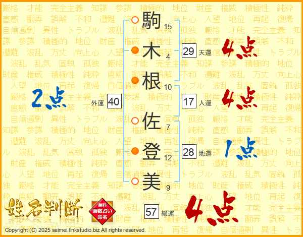 駒(15画)木(4画)根(10画) 佐(7画)登(12画)美(9画)