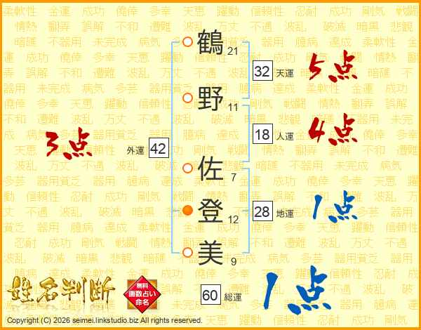 鶴野佐登美さんの天運は32画の5点!