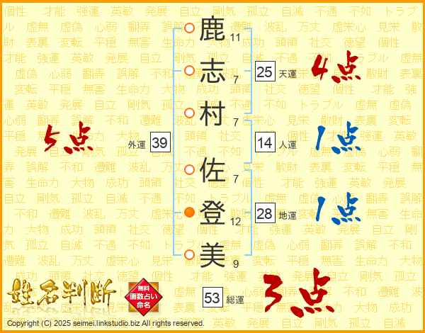 鹿(11画)志(7画)村(7画) 佐(7画)登(12画)美(9画)