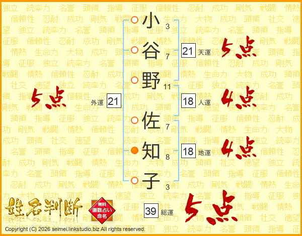 小(3画)谷(7画)野(11画) 佐(7画)知(8画)子(3画)