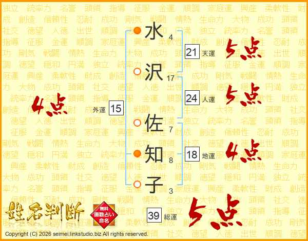 水(4画)沢(17画) 佐(7画)知(8画)子(3画)