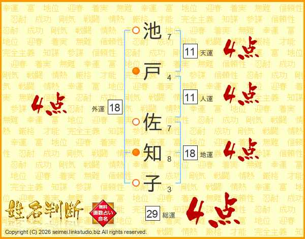 池(7画)戸(4画) 佐(7画)知(8画)子(3画)