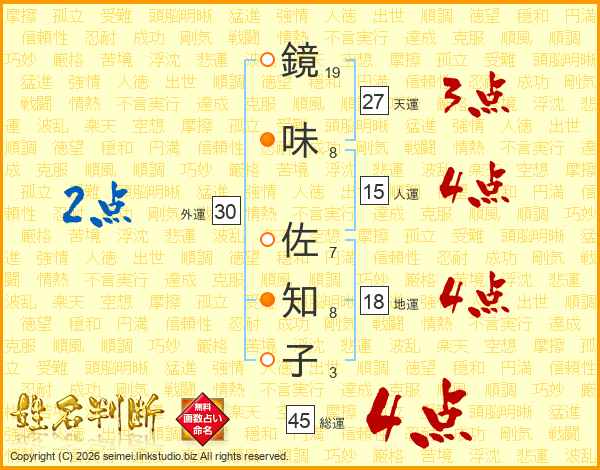 鏡(19画)味(8画) 佐(7画)知(8画)子(3画)