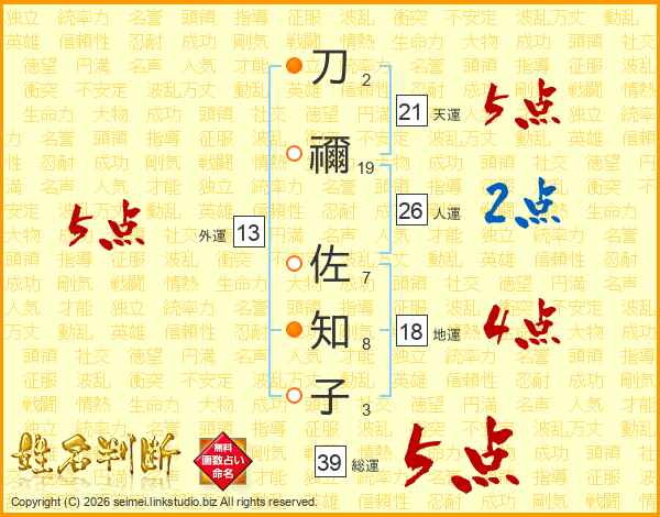 刀禰佐知子さんの総運は39画の5点!