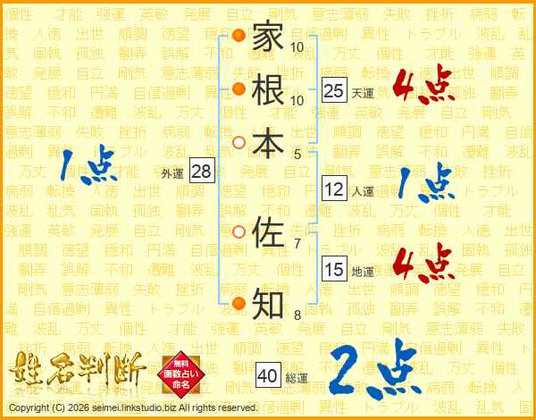 家(10画)根(10画)本(5画) 佐(7画)知(8画)