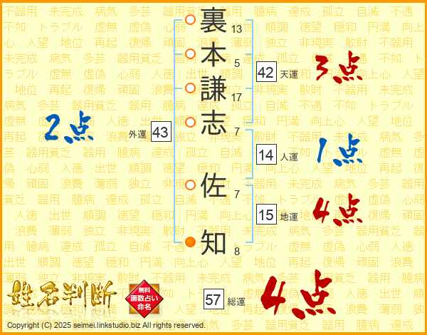 裏(13画)本(5画)謙(17画)志(7画) 佐(7画)知(8画)