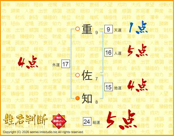 重(9画) 佐(7画)知(8画)