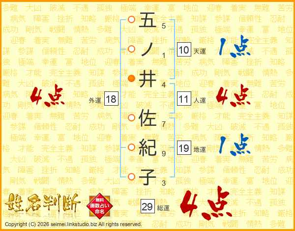 五(5画)ノ(1画)井(4画) 佐(7画)紀(9画)子(3画)