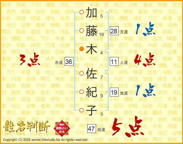 加(5画)藤(19画)木(4画) 佐(7画)紀(9画)子(3画)