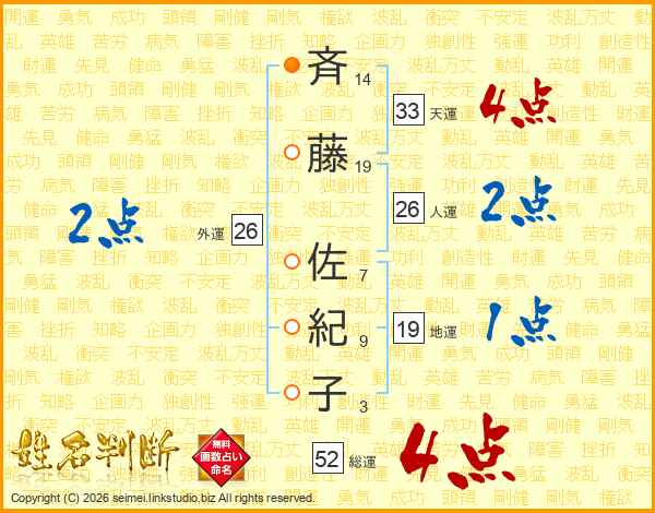 斉藤佐紀子さんの総運は52画の4点!