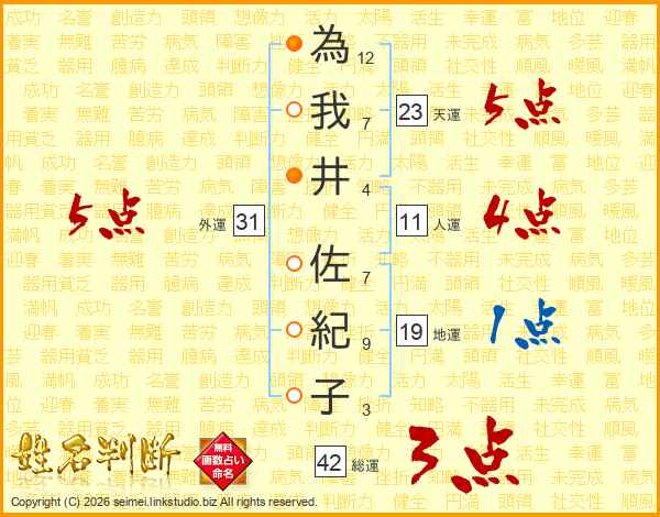 為(12画)我(7画)井(4画) 佐(7画)紀(9画)子(3画)