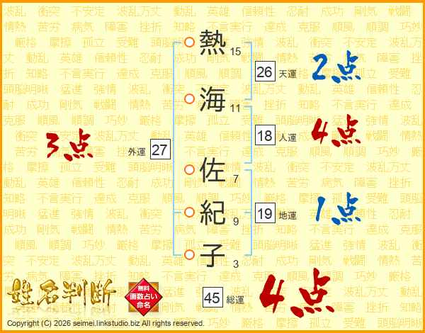 熱(15画)海(11画) 佐(7画)紀(9画)子(3画)