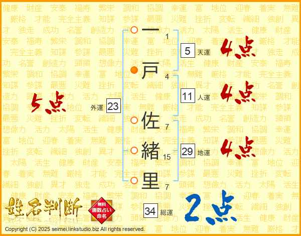 一(1画)戸(4画) 佐(7画)緒(15画)里(7画)