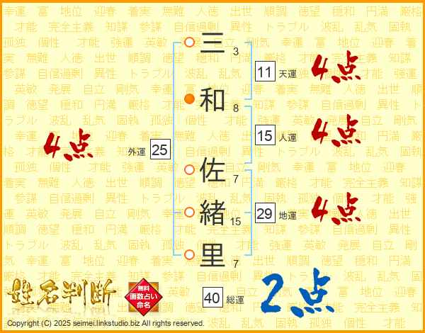 三(3画)和(8画) 佐(7画)緒(15画)里(7画)