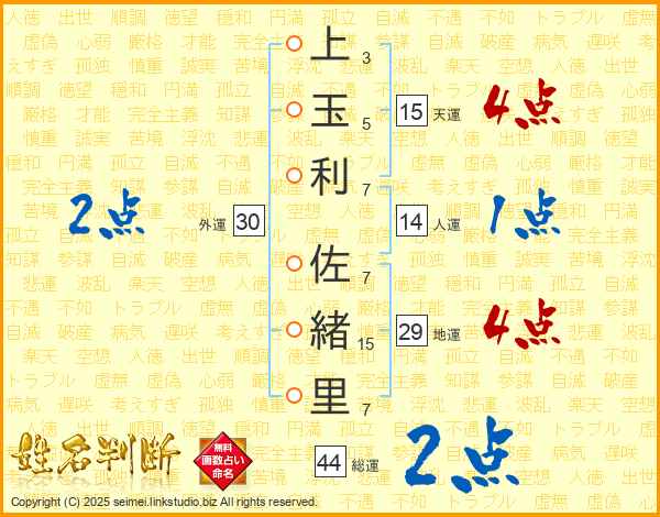 上玉利佐緒里さんの総運は44画の2点!