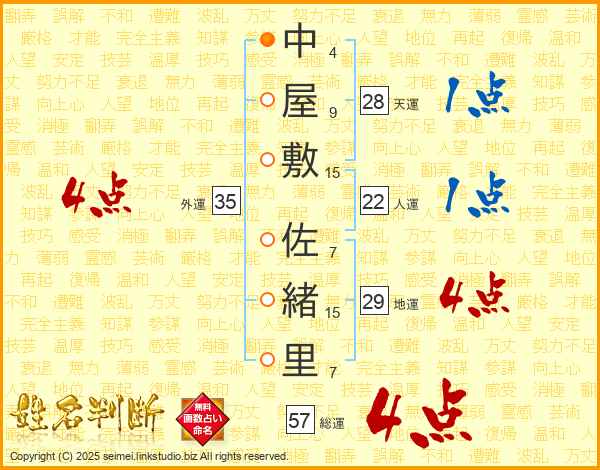 中(4画)屋(9画)敷(15画) 佐(7画)緒(15画)里(7画)