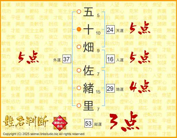 五(5画)十(10画)畑(9画) 佐(7画)緒(15画)里(7画)