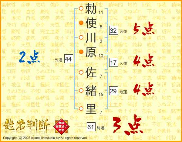 勅(11画)使(8画)川(3画)原(10画) 佐(7画)緒(15画)里(7画)