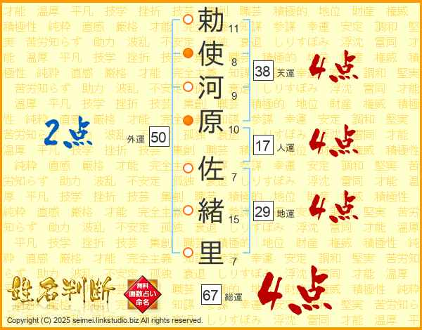 勅(11画)使(8画)河(9画)原(10画) 佐(7画)緒(15画)里(7画)