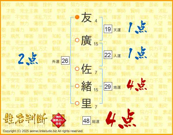 友(4画)廣(15画) 佐(7画)緒(15画)里(7画)