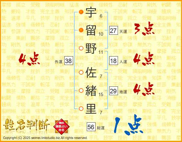 宇(6画)留(10画)野(11画) 佐(7画)緒(15画)里(7画)