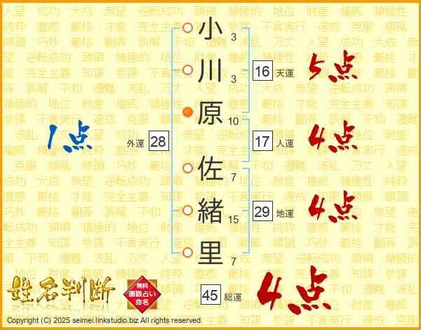 小川原佐緒里さんの総運は45画の4点!