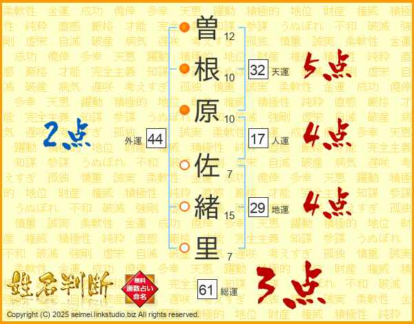 曽(12画)根(10画)原(10画) 佐(7画)緒(15画)里(7画)