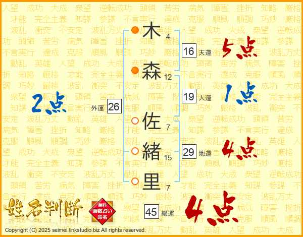 木(4画)森(12画) 佐(7画)緒(15画)里(7画)