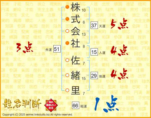 株式会社佐緒里さんの総運は66画の1点!