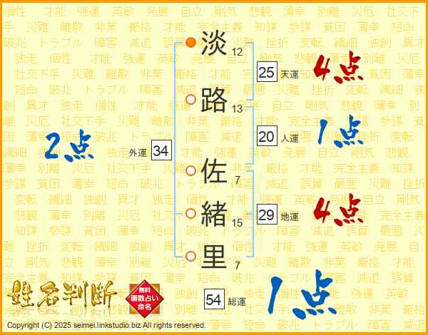 淡(12画)路(13画) 佐(7画)緒(15画)里(7画)