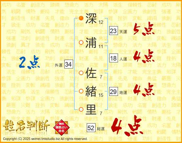深(12画)浦(11画) 佐(7画)緒(15画)里(7画)