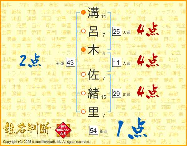 溝(14画)呂(7画)木(4画) 佐(7画)緒(15画)里(7画)