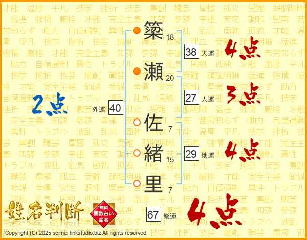 簗(18画)瀬(20画) 佐(7画)緒(15画)里(7画)