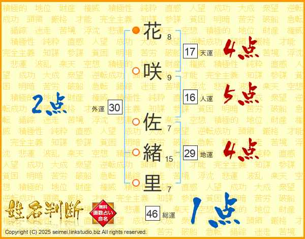花(8画)咲(9画) 佐(7画)緒(15画)里(7画)