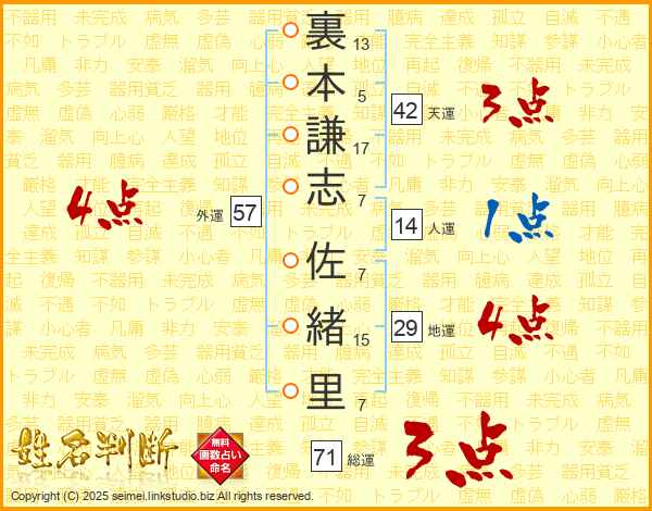 裏(13画)本(5画)謙(17画)志(7画) 佐(7画)緒(15画)里(7画)