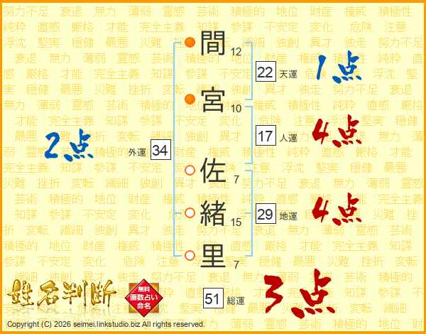 間(12画)宮(10画) 佐(7画)緒(15画)里(7画)