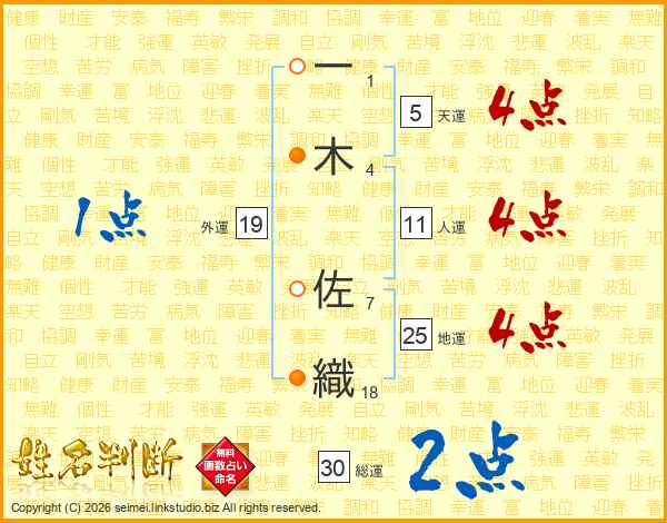 あなたの人生を表す1番重要な運勢です。生涯を通じて影響する総合運となり、主に50歳以降の晩年期に影響を及ぼします。苗字と名前の合計画数。