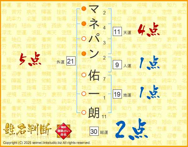 マ(2画)ネ(4画)パ(3画)ン(2画) 佑(7画)一(1画)朗(11画)