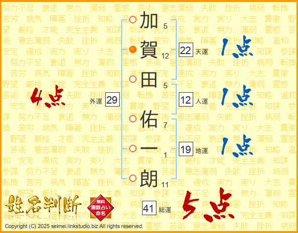 加(5画)賀(12画)田(5画) 佑(7画)一(1画)朗(11画)